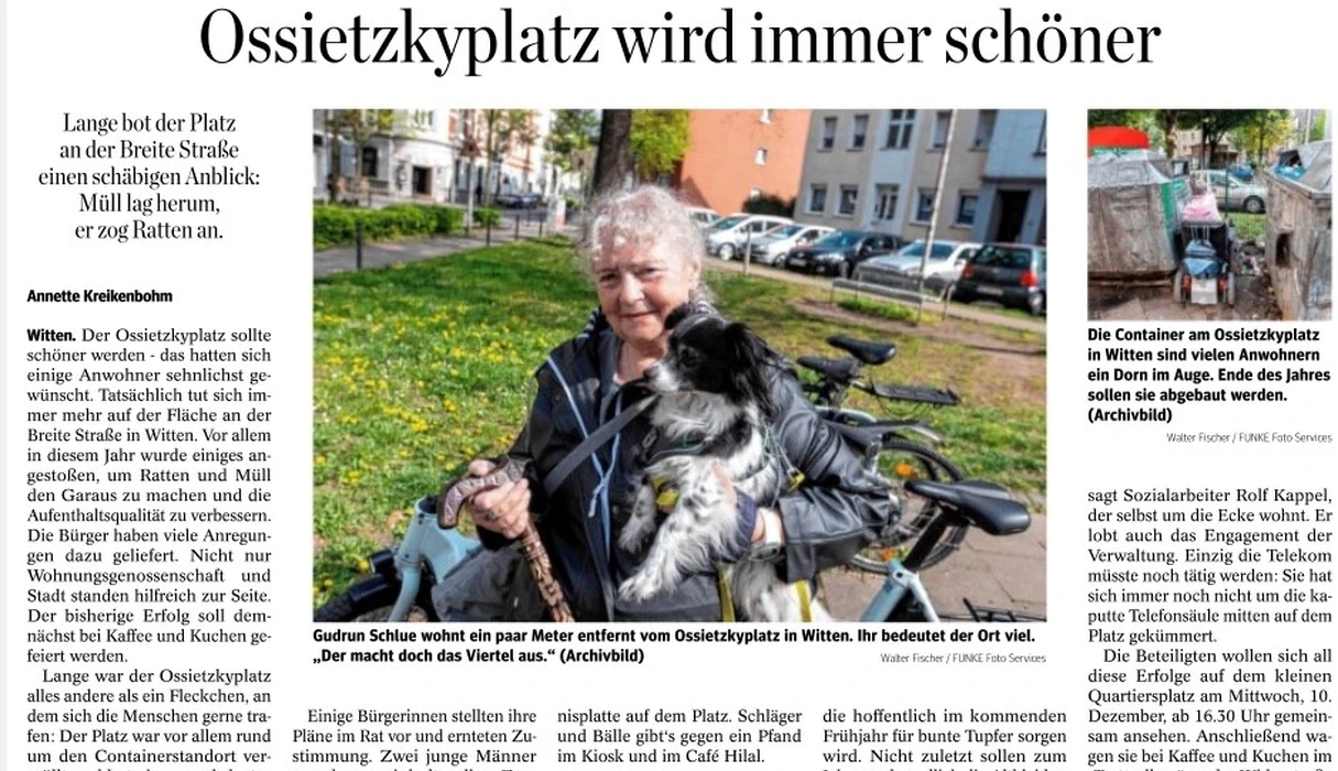 Der Artikel aus der WAZ Witten vom 8. Dezember 2025 berichtet über die Verschönerungsmaßnahmen am Ossietzkyplatz in Witten. Der Platz, der früher als unangenehm galt – mit Müll und Rattenproblemen – hat sich in diesem Jahr stark verbessert. Die Bürger haben Vorschläge zur Aufwertung des Platzes gemacht, und die Stadt sowie unsere Genossenschaft hat Maßnahmen zur Verbesserung der Sauberkeit und der Aufenthaltsqualität ergriffen.